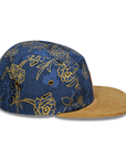 A denim fabric, layered with light blue print and gold stroke flowers!